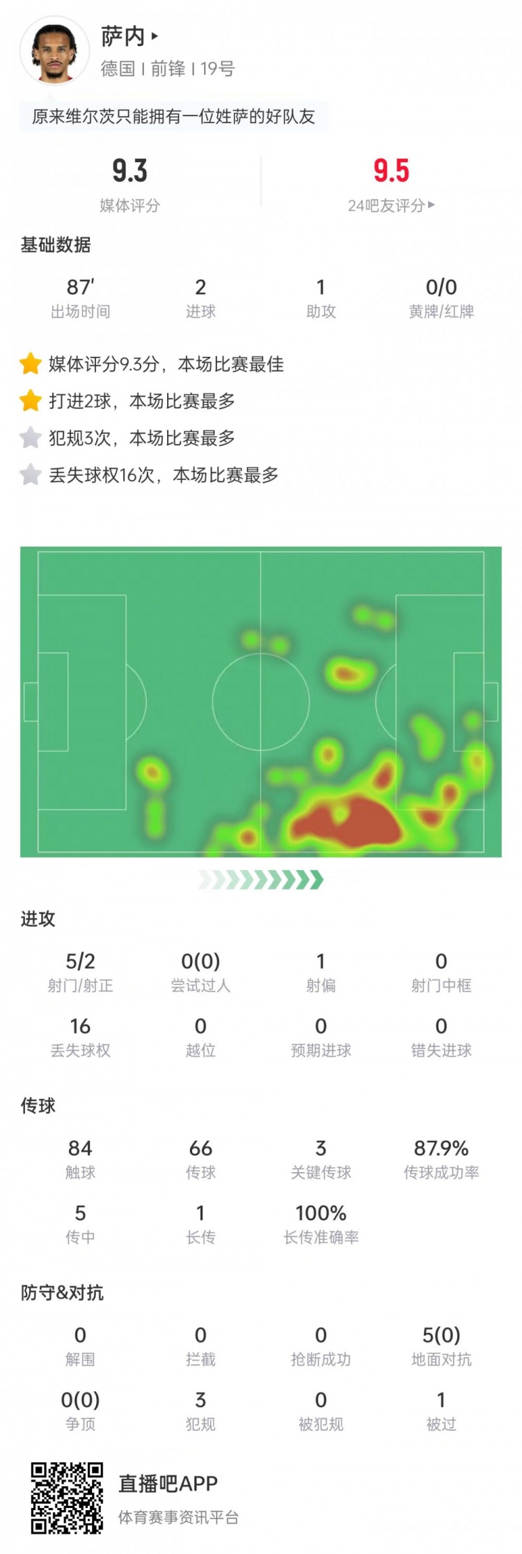 萨内本场数据:2球1助+3次关键传球,获评9.3分全场最高